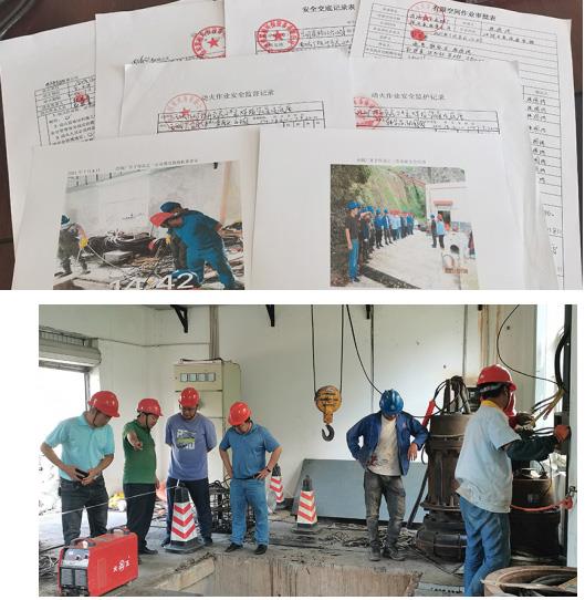 厂部在日常运行中发现2#提升泵进水量明显减少,在经过仔细检查发现为2#提升泵上水管锈蚀穿孔。为确保西城污水厂能够连续稳定运行并及时消除安全隐患。经公司经理办公会研究决定,对锈蚀漏水的2#上水管进行拆除换新作业,对2#提升泵进行拆解保养,同时对控制柜内刀闸开关及变频器进行更换。由于整个作业需在14米深的集水池下进行,作业空间有限,且工程量大、维修时间长、难度系数高,同时作业涉及防中毒、防爆炸、防触电、防高空坠落等多项安全工作需要同时开展。公司领导高度重视,作业前组织安全质量部、 运营管理部、西城污水厂、施工单位根据现场实际情况制定了详细的施工方案并进行了充分的模拟实验。