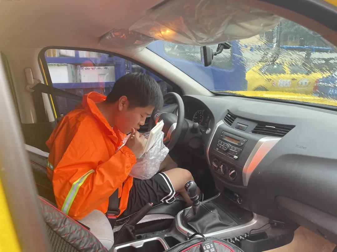 帮助女生过了马路后,他又迅速投入到防汛工作中。风雨中,他全身都湿透了,雨靴里也灌进了水,大雨不停,人就要一直在岗。那天中午,他匆匆忙忙在车上吃了份盒饭,又回到雨中,协助指挥交通、提醒市民注意安全、帮市民推电动车,一直忙到下午5点路上积水退去,大家又开始撤去围挡、检查污水井防坠网、恢复井盖,清理路面杂物。