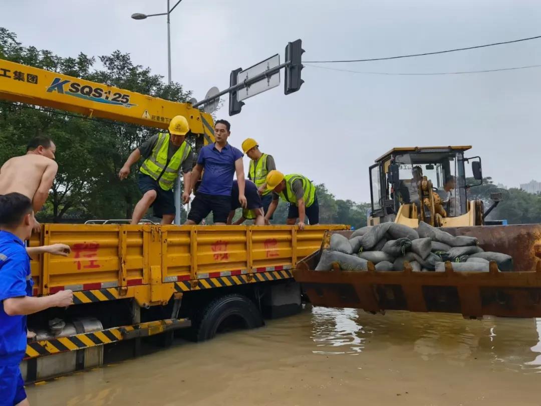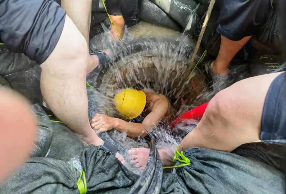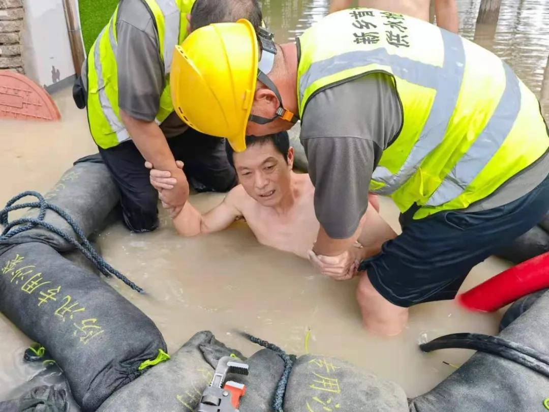 这是一张新乡电视台抓拍的镜头:在新乡最大持续降水达到907毫米的这一天,新乡供水保障团队在用沙袋和人体铸成的简陋防洪措施下抢修新二街供水管网的场景。