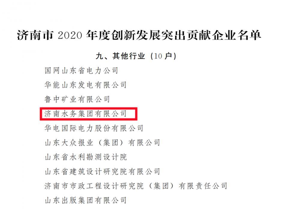 济南水务集团有限公司被评为 “济南市2020年度创新发展突出贡献企业”