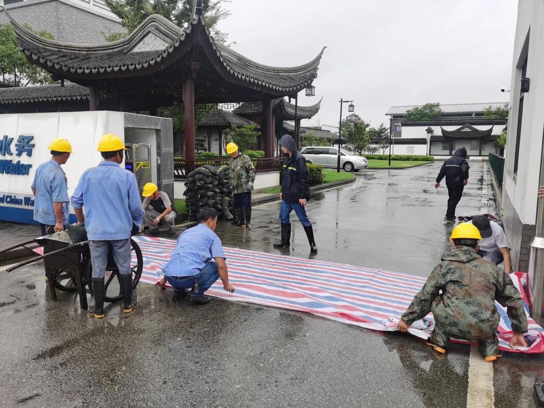 水源厂作为重点点位,在台风来临前,吴江华衍水务再次对各项防汛措施进行了加固,在各路口增设了沙包墙,防止水位升高流入公司;配备应急抽水泵、排水增压泵,加强排水能力。