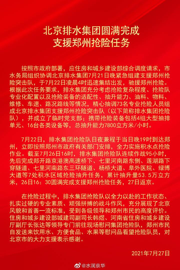 按照市政府部署,应住房和城乡建设部综合调度请求,市水务局组织协调北京排水集团7月21日晚紧急组建支援郑州抢险突击队,于7月22日凌晨4时迅速集结出发,驰援郑州抢险。截至7月26日16时,排水集团抢险队连续作战95小时,先后完成郑开路京港澳高速桥下、七里河南路东侧、莲湖路下穿隧道、七里河南路东三环隧道、杨桥大道、阜外医院、绿博大道等7处积水区域抢险抽升任务,累计抽升量53.5万立方米,圆满完成支援郑州抢险任务。