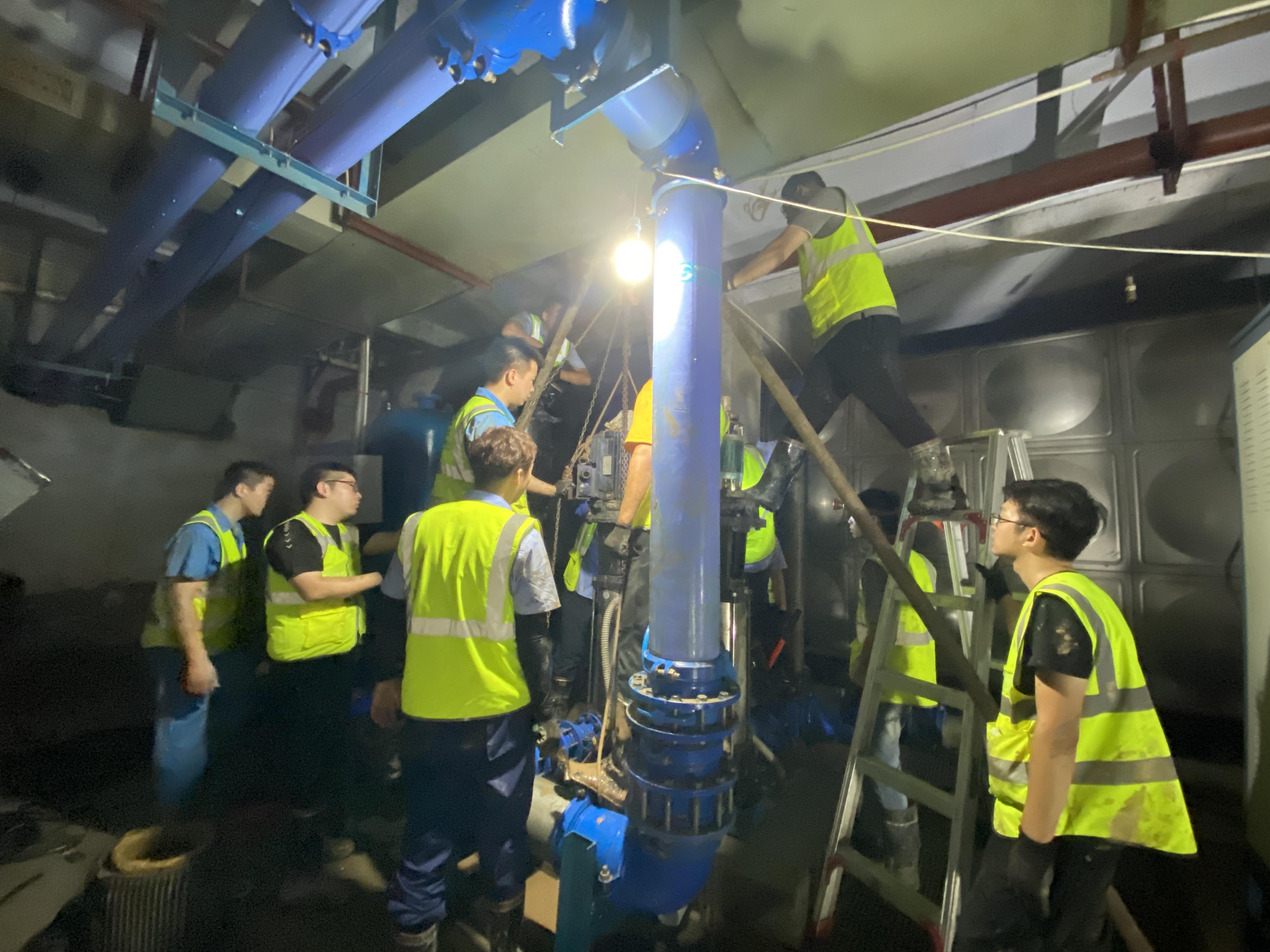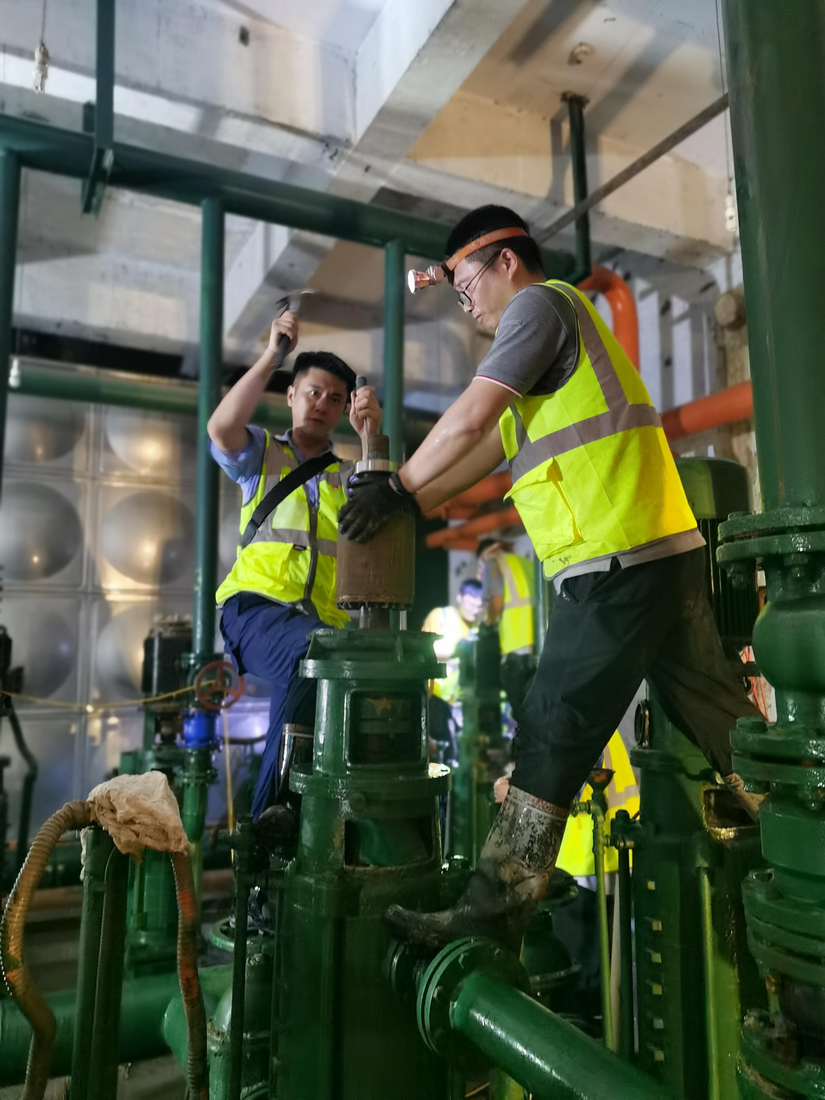7月25日中午12时,小水牛突击队到达郑州,顾不上吃饭,就到中原区帝湖花园查看现场。帝湖花园是此次受灾最严重的大型社区之一,共有5290户居民,分为东王府、西王府、双鱼座三个小区。自7月20日以来,一直停水停电。三个小区的二次供水加压泵房位于地下室负1楼,泵房里面的配电柜、控制柜全部进水损坏,10台水泵电机需要拆卸后检修、烘干、测试,仅烘干就需要6个小时。由于在郑州当地不具备条件,小水牛突击队冒着地下室几乎没膝的泥水和漆黑,将十台电机拆除后装车。当日晚上20时30分,连夜将设备拉回洛阳维修。