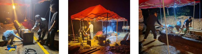 由于焊接大型水管技术要求高,再加上是夜晚施工,施工难度又增加了不少,为了确保精准焊接,防止水管漏水,工人们直接趴在地上焊接。