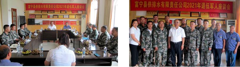 在建军83周年之际,富宁县供排水公司组织在公司工作的退伍军人进行座谈。公司共有10名退伍军人,他们来自全军各兵种,有陆军、海军,有武装警察部队。他们当中有参加过对越自卫反击战的三级战斗英雄,有参加过“汶川大地震”抗震救灾的英雄子弟兵,有参加过抗洪抢险的标兵。他们从部队退役进入公司后,大部份参加过富宁县“8•25特大洪灾”抗洪抢险工作,体现出了一名军人应有的战斗素质,为国家和公司立下了“汗马功劳”,他们的付出“默默无闻”,正是有了他们不计个人得失的辛勤付出,才有了国家和平,公司荣耀。10名退伍军人,在公司员工占比不足10%,但他们却是富宁县供排水公司的排头兵,真正体现了“干在实处、走在前列”的精神风貌。