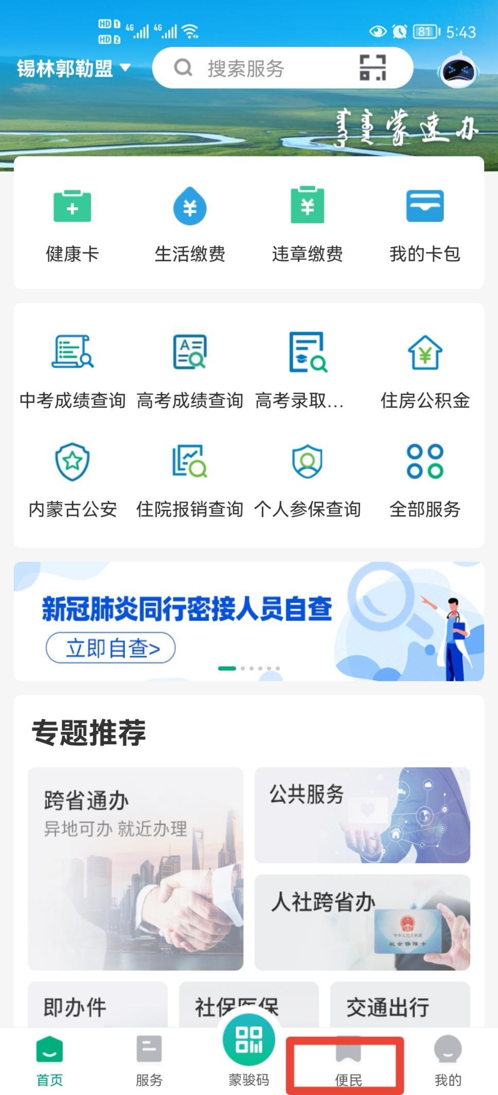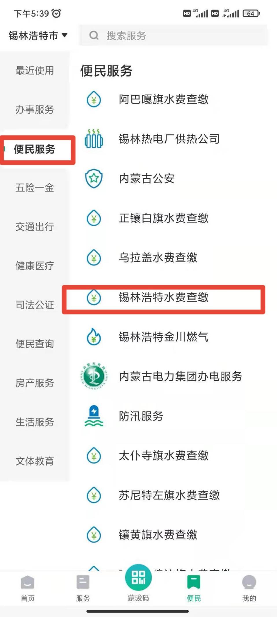 第二步:进入APP后点击右下角“便民”→点击左侧菜单栏“便民服务”→点击“锡林浩特旗水费查缴”;