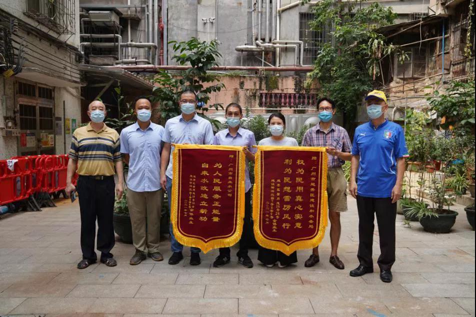 为了尽快完成工程,在2021年广州新冠疫情严峻的时刻,改造工程人员仍然坚守岗位,做到防疫与供水建设两不误,开展科学高效施工,最终在7月实现竣工通水,增强了居民用水的安全性、稳定性,并实现了一户一表,移表出户,抄表到户,让供水设施得到专业化管理,得到了居民的一致称赞。为民解难题,锦旗呈民心!