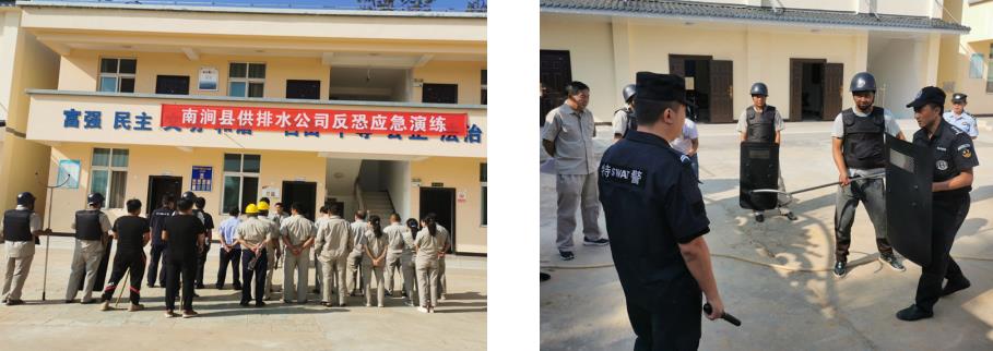 为进一步提高公司应急处置队伍的实战能力,使其在发生恐怖突发事件紧急情况下作出迅速反应,有效做好防范措施和处理工作,降低事故造成人员伤亡和财产损失、以及对县城供水的危害,经过精心计划和准备,公司于2021年8月2日在二水处理厂组织开展反恐应急处置演练,此次演练得到了公司领导的高度重视,同时还邀请了县公安局、反恐办相关领导到现场指导。根据《南涧县供排水公司反恐应急预案》,演练成立南涧县供排水公司应急指挥部,由董事长曹永奇同志亲自担任指挥长,副董事长黄耀生、工会主席杨红暄担任副指挥长,其下设6个组:综合信息组、现场布控组、安全保卫组、救护组、设施抢修组、后勤保障组。