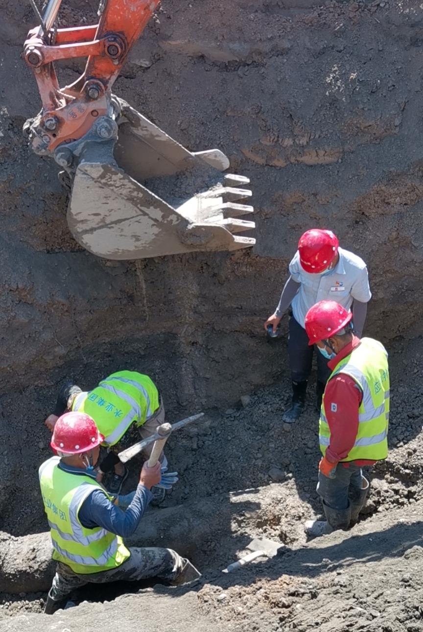为争分夺秒完成抢修任务,现场两台挖掘机同时进行作业。机械开挖后,人工缓慢清掏出破损管线,长达6米的DN350铁铸管线开裂破损。乌鲁木齐水业集团党委委员、副总经理谢东,抢修中心党支部书记、主任彭炜,沙区供水公司经理杨斌,营销服务部助理董祥佳在现场反复研讨抢修方案,最终决定将中间断裂的6米管线全部更换。