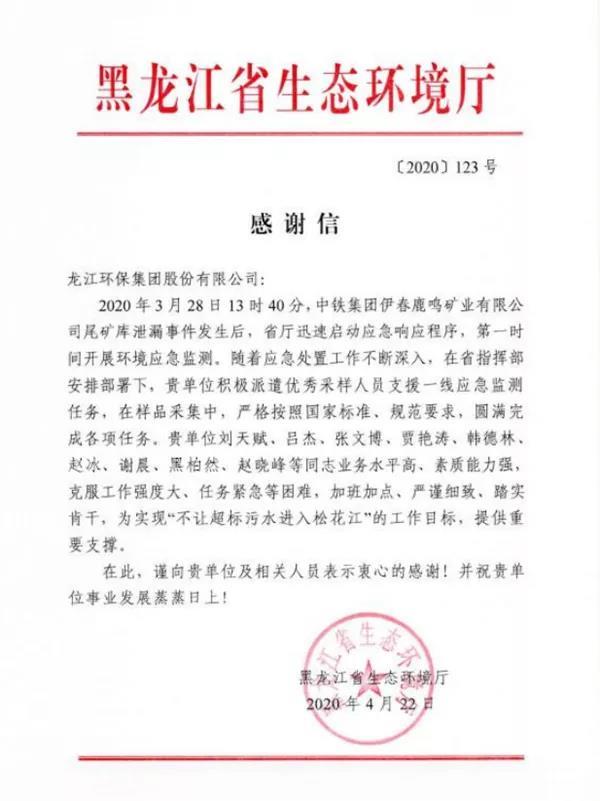 紧急驰援,党员拼搏在一线。2020年3月,伊春鹿鸣矿业发生尾矿砂泄漏事故,造成依吉密河流域受到污染。集团党委高度重视,集团副总裁张福贵同志第一时间组织带领技术人员连夜奔赴现场驰援,大家以时不我待、只争朝夕的精神,迅速投入现场试验、制定方案、24小时连续采样等工作中,共开展絮凝药剂优化选择、活性炭脱色效果验证等系列实验10余项,编写实验报告5份,受到了各级领导及业界的一致好评,生态环境部认为本次尾矿砂泄漏事件的应急处置是突发环境事件应对的成功范例。