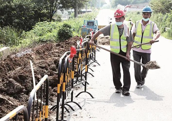 改造现场,施工人员已沿公路开挖沟槽,并用加压设备连接PC管道。