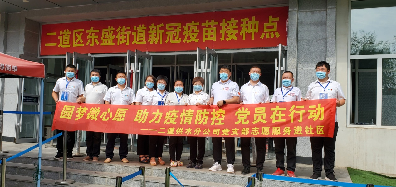 二道供水分公司党支部与东盛街道万通社区联系,帮助社区工作人员减轻工作负担,为前来打疫苗的老人提供帮助。