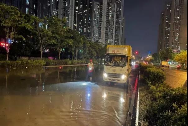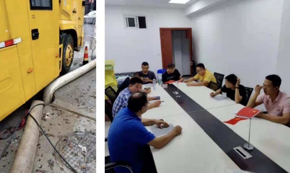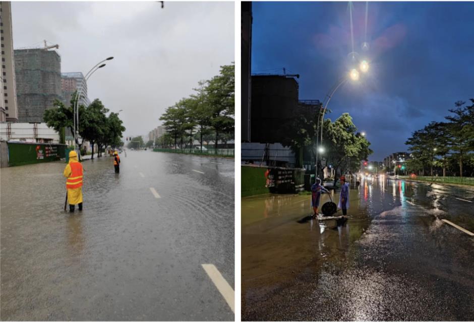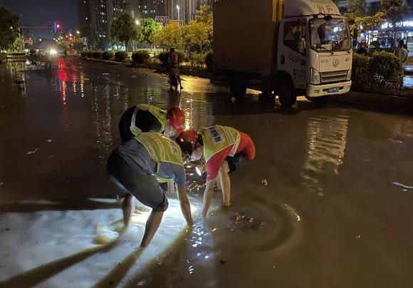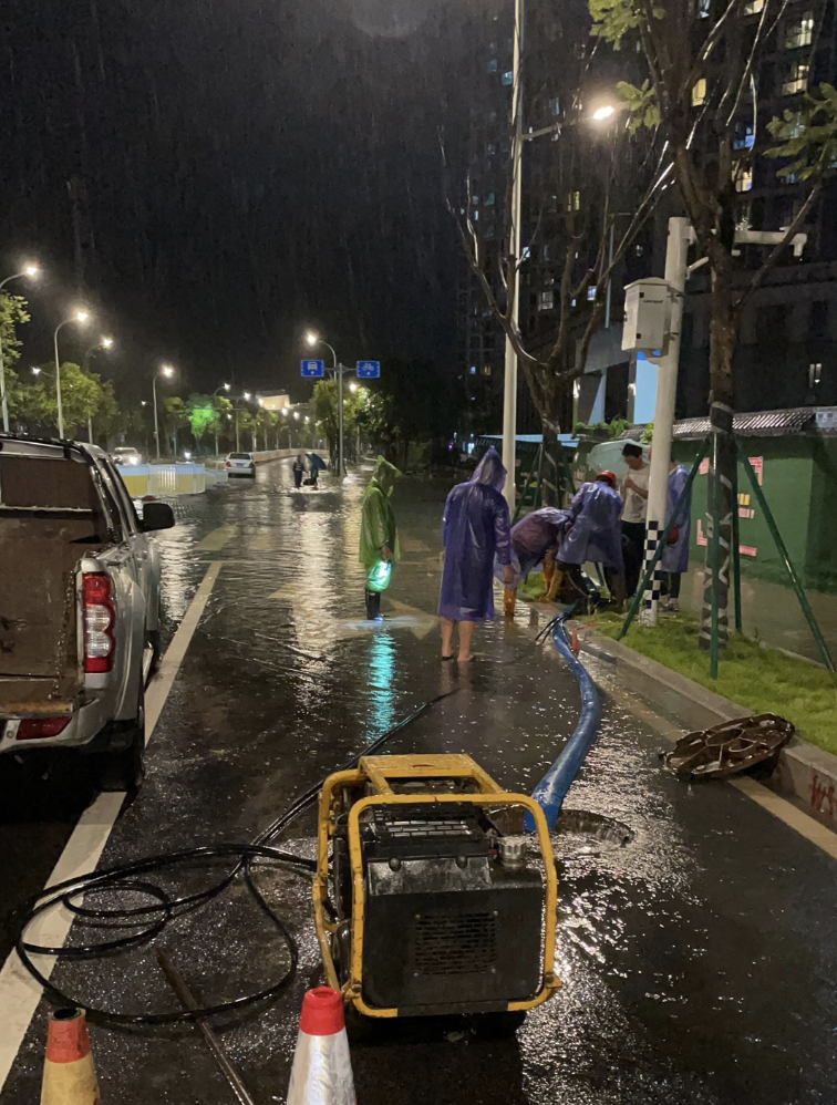 值守联排联调中心的同事第一时间将汛情传递至防汛排涝一线队伍。防汛排涝现场,就是践行初心使命的战场。当这座城市还沉浸在睡梦中时,排水公司的排水抢险队伍已经快速出击,根据预案安排第一时间到岗到位,通过采取打开雨水箅及检查井,清理雨水箅垃圾,启用动力站、“龙吸水”等措施加速排水,并设置危险警示牌,防止出现行人、车辆坠井事故。