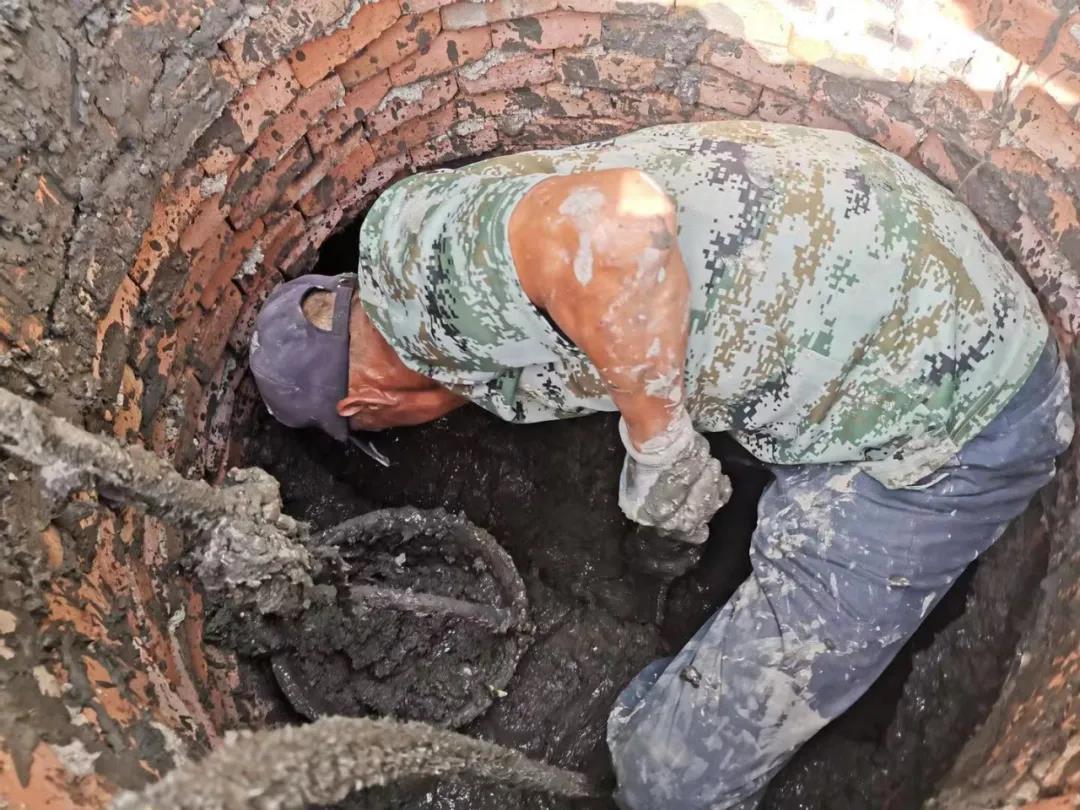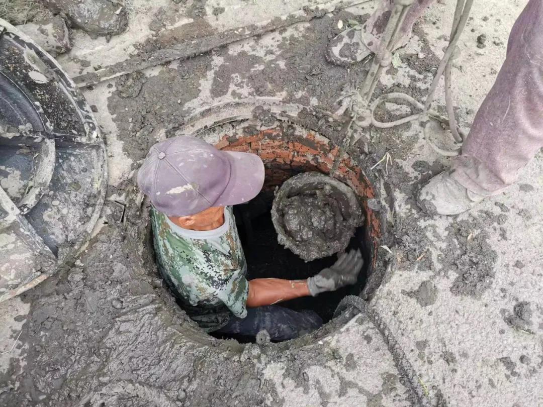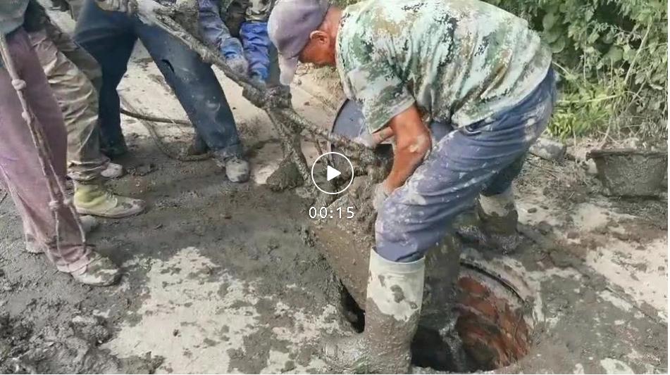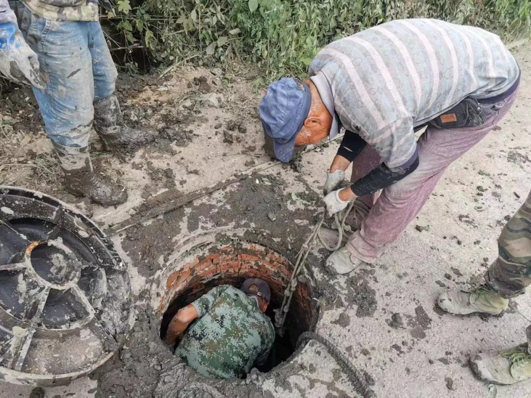 挪开井盖、找准位置,工作人员使用自制的锥形铁桶,前方搭载农用车,将管道内淤泥、垃圾等杂物拖拽至检查井口附近,再用人工一点一点把污泥垃圾清理干净。