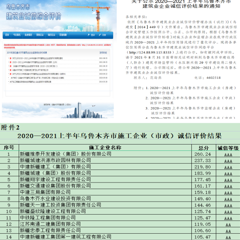 8月25日,乌鲁木齐市建设局(人防办)官方网站,对2020年至2021年上半年乌鲁木齐市建筑业企业诚信评价结果进行公示,乌鲁木齐水业建设投资有限公司在乌市1927家施工企业(市政)诚信评价结果中位列第8、诚信总分149.4、诚信等级“AAA”。