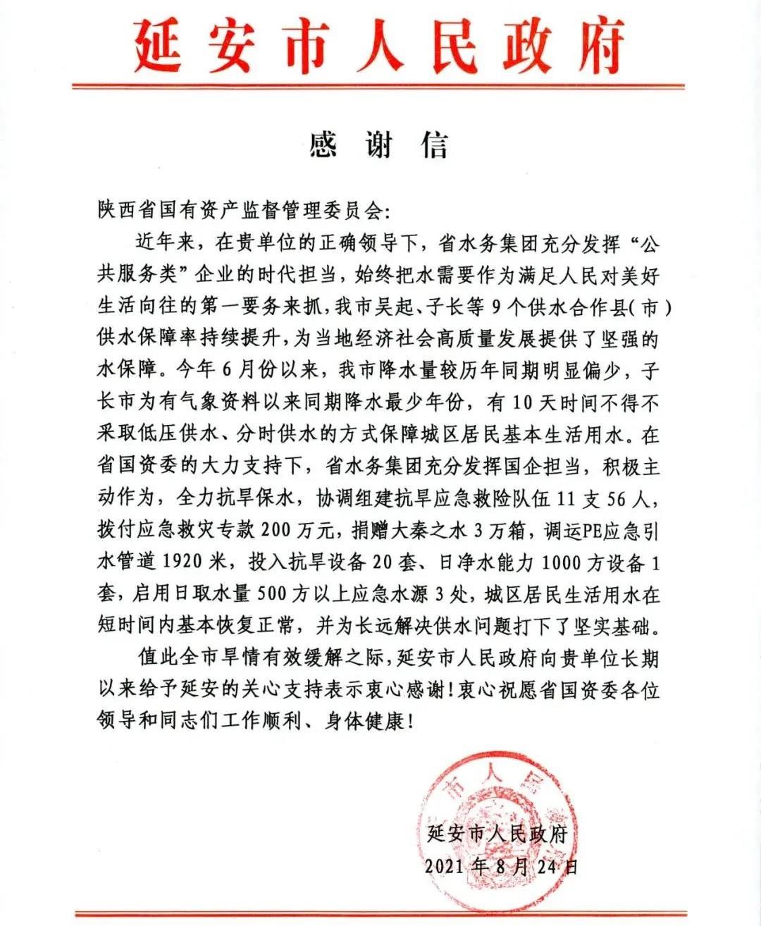 延安市政府向省国资委发来感谢信表扬陕西水务
