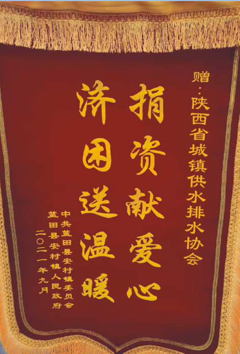 蓝田县安村镇政府人大主任胡小林和民政工作站站长康小平代表当地政府和受灾群众接收了捐赠物品,并向陕西省城镇供水排水协会和陕西亮亮通商贸有限公司(康泰塑胶科技集团)赠送锦旗。