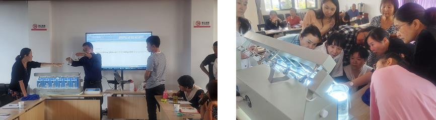 会议开始,首先开展混凝搅拌实验现场培训。混凝是水厂最重要的处理工艺,通过实验取得最佳投药量能有效指导水厂生产。培训通过理论知识与演示教学相结合的方式,对实验原理、方法步骤、结果分析等方面进行详细讲解,激发参训职工学习兴趣与主动性,引导职工优化知识结构,提高精益生产意识与水质分析素养,使效果落到了实处,保障了安全生产,提升了生产效益。