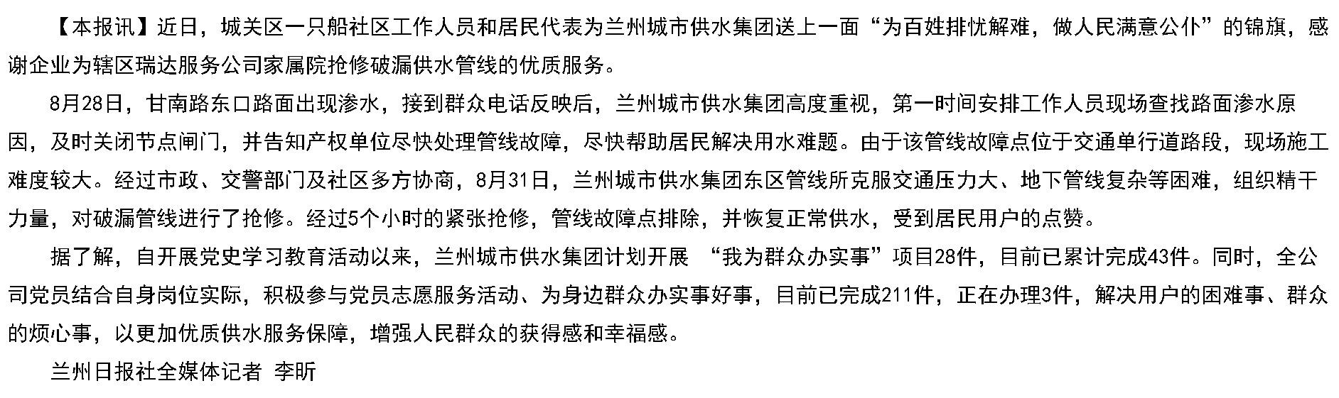兰州城市供水集团:抢修破漏管线获赞