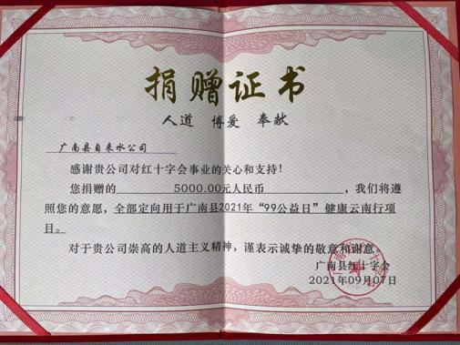 弘扬时代主旋律,传播社会正能量,涓涓细流,汇成大海。近年来,自来水公司积极履行社会责任,心系困难群众,支持关心慈善事业,通过开展“抗疫爱心捐款”、“99公益日”和志愿服务等多种举措,让支持和参与公益事业的广南供水人用实际行动践行公民的社会责任,为广南慈善事业贡献城市供水力量。