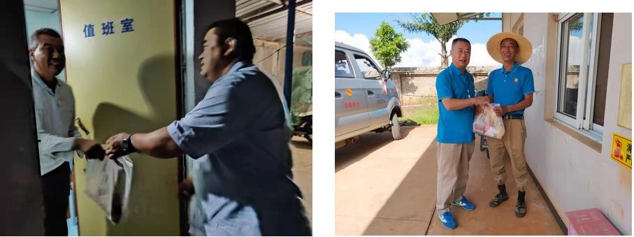 2021年9月21日下午,在公司董事长鲁跃军的带领下,对所辖大树水厂、清水龙潭水厂、小石山水厂、喷泉值班室、人民路值班室、弥勒北值班室、东风值班室、大树龙潭泵站的工作人员进行节日慰问,为过节期间仍然坚守在水处理工作一线的员工,送上月饼、水果等慰问品。