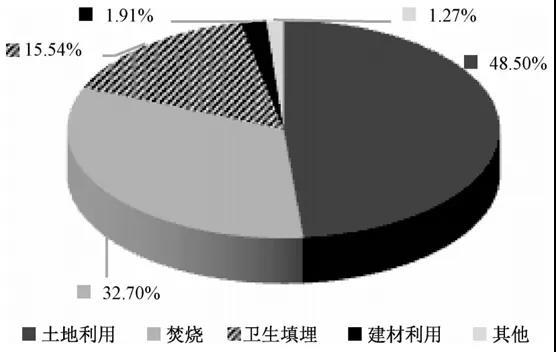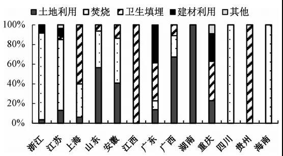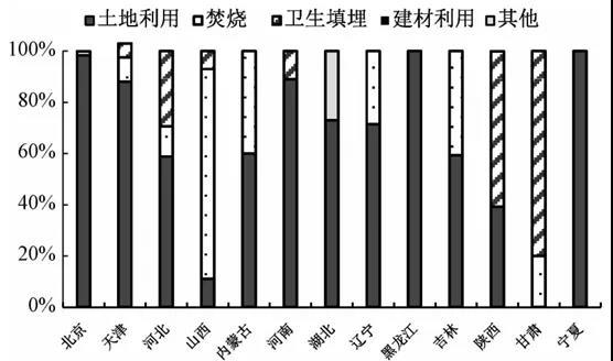 北方地区污泥处置出路如图3所示,处置方式较统一,除山西以焚烧为主,其他地区主要以土地利用为主,部分地区以填埋为主。