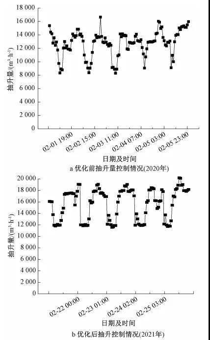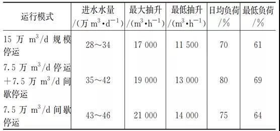 再生水厂结合来水时变化及日变化规律,通过生物池及膜池间歇停运的方式(见表4),提高日水力负荷至70%以上。并充分利用上游污水管网调蓄功能,控制瞬时最低抽升量不低于运行曝气池负荷的60%(见图3b)。