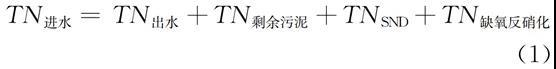 污水生物脱氮是指在活性污泥微生物的新陈代谢作用下,将污水中的含氮化合物转化为N2而最终逸出到大气的过程。一般来说,再生水厂氮的去除主要包括剩余污泥排放、好氧区同步硝化反硝化(SND)以及缺氧反硝化等方面。氮在污水处理系统内的平衡见式(1):