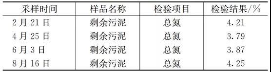 微生物在生长繁殖过程中,会摄取污水中一部分氮来合成自身细胞组分,采用《城镇污水处理厂污泥检验方法》(CJ/T 221-2005)第49章中的方法对剩余污泥中氮含量进行检测,检测时间为2020年,检测结果见表1。