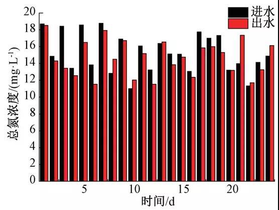再生水厂以3.75万m³/d规模生物池为研究对象,控制该生物池污泥浓度为6 500 mg/L、水温23 ℃、混合液回流比为500%、生物池好氧区前、中、后段DO分别为1.5 mg/L、1.2 mg/L以及0.5 mg/L。对好氧段进出水的总氮浓度变化进行检测,结果如图1所示。