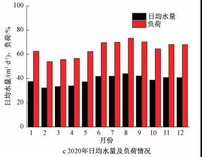 受城市生产活动的影响,污水处理厂在实际运行过程中不同时段、季节来水水量呈规律性波动。水力负荷过低或水量时变化系数过大对回流液DO浓度、内回流比等脱氮重点指标控制会带来一定困难。以再生水厂2020年来水情况为例,水量峰谷差值比例超过50%(见图3a),瞬时最低负荷仅为设计值的30%。不同月份水量差异也较为明显,最低负荷仅为设计值的53%(见图3c)。