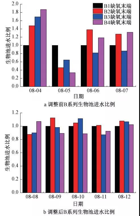 在不考虑厌氧区和缺氧区氨氮浓度变化的情况下,以氨氮作为指示物,在固定回流量的前提下,化验缺氧一段出水氨氮浓度,能够确定定每座生物池进水比例。为方便运行人员开展配水作业,水厂将原有普通电动闸门改造为带有刻度显示的auma电动头,并将开度信号上传至远程中控室上位机,实现闸门开度的精确调整。如图5所示,开展配水优化工作后,各生物池间进水均匀度明显提升,同一系列各生物池间进水比例差值由33%降低至15%左右。