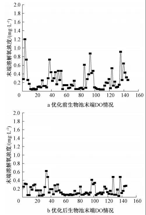 通过配水优化、抽升控制、生物池倒运等方式,稳定生物池水力负荷。优化后,生物池DO稳定性明显提高(见图6b),末端DO浓度基本低于0.5 mg/L,满足反硝化对于DO浓度的要求,同时大大降低了回流液中的DO对于进水碳源的浪费。