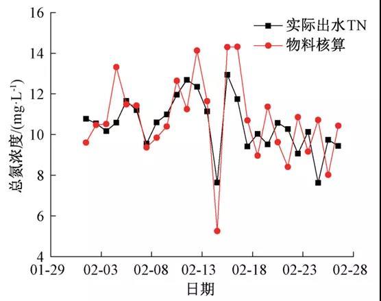 以再生水厂2020年2月份的实际出水TN与物料平衡方程模拟出水TN进行对比,结果如图7所示。