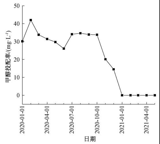 (4) 通过建立氮的物料平衡模型,对工艺运行参数进行过程控制,再生水厂甲醇投配率逐渐降低,于2021年实现了碳源零投加。
