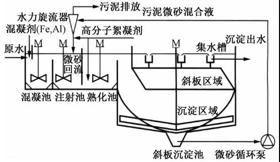 Actiflo高效沉淀工艺由混凝池、投加池、熟化池、斜管(板)沉淀池以及微砂循环和污泥排放系统组成。具体结构见图4。
