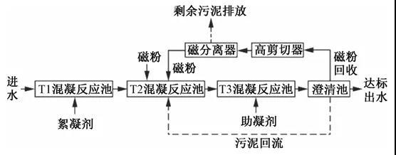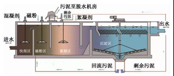 污水进入快速混合区并投加混凝剂,快混区内设有快速混合搅拌机,污水与混凝剂快速混合后进入磁介质混合区。在磁介质混合区内设置搅拌器,污水与补充磁介质及回收利用的磁介质充分混合后经底部进入絮凝反应区。絮凝反应区内投加絮凝剂,由絮凝搅拌机进行充分的絮凝反应后溢流到沉淀区。沉淀区上部设有斜管。充分絮凝的磁团混合体进入沉淀区,快速沉降在沉淀池底部,由刮泥机刮集至中心的污泥斗并分为二路,一路由回流泵提升至磁介质混合区,另一路由剩余污泥泵抽出并送至磁介质回收系统进行磁团剥离和磁介质回收,回收的磁介质再次进入磁介质混合区继续参与反应。剩余污泥则进入后续污泥处理系统。