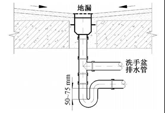 设计建议:利用地漏附近的洗手盆排水对地漏水封补水,补水点设在存水弯前的短管上,水封有效高度不小于50 mm、不大于100 mm,如图4所示。