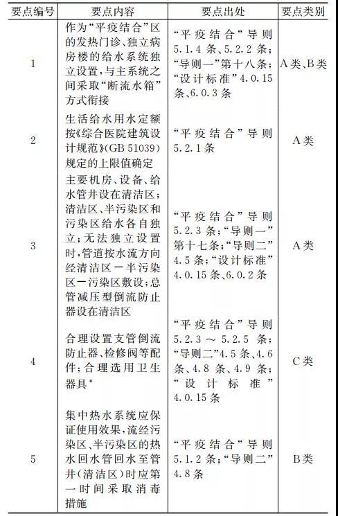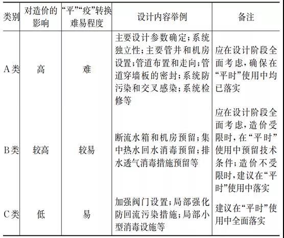 注:表中将“*”归为C类,主要考虑诸如感应式水龙头等器具在综合医院中的接受程度日趋普遍,此类卫生器具的选用在“疫时”为应执行内容,而在“平时”则为具一定利好的可执行内容,在“平时”实施到位,可避免二次施工和投资。