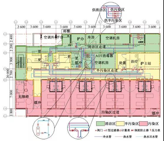 (5)要点5简析:集中热水系统为了保证用水点的出水使用要求,需要保证用水部位入户支管减压阀前进行循环,且循环点至出水点的管道长度尽可能短。管道在敷设时难以避免会穿越半污染区进入病房卫生间、诊室等污染区,为了严格防交叉感染,在回水管回水至清洁区管井时第一时间采取消毒措施。