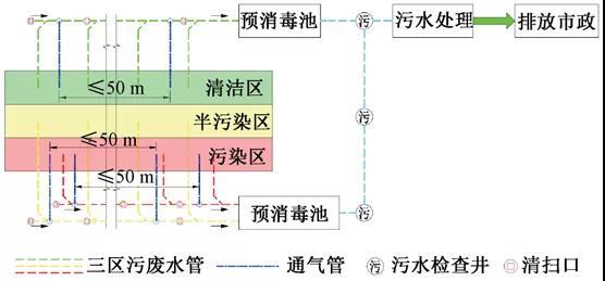 设计建议:根据土建专业“疫时”平面划分的清洁区、半污染区、污染区,三区各自设置独立的排水系统及其通气系统,相互不串接。