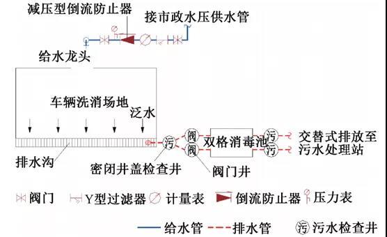 设计建议:洗消场地设置给水龙头、排水沟、埋地式消毒池,如图8所示。从市政水压给水管接出给水支管,设置减压型倒流防止器或压力型真空破坏器。排水沟接入埋地式消毒池预处理后废水排入院区污水处理站。
