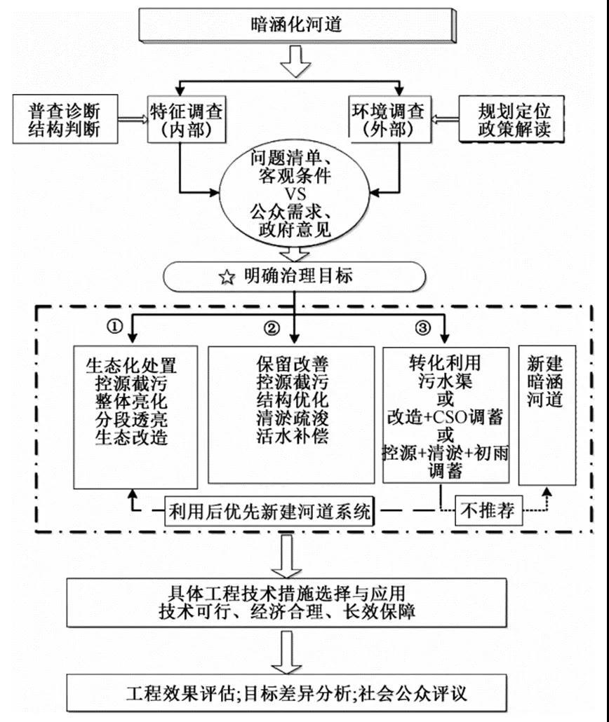 暗涵化河道治理可根据其内外部特征及目标情况确定不同的治理方式,在确定具体技术方案前需择取适用的一般原则,总体原则为: