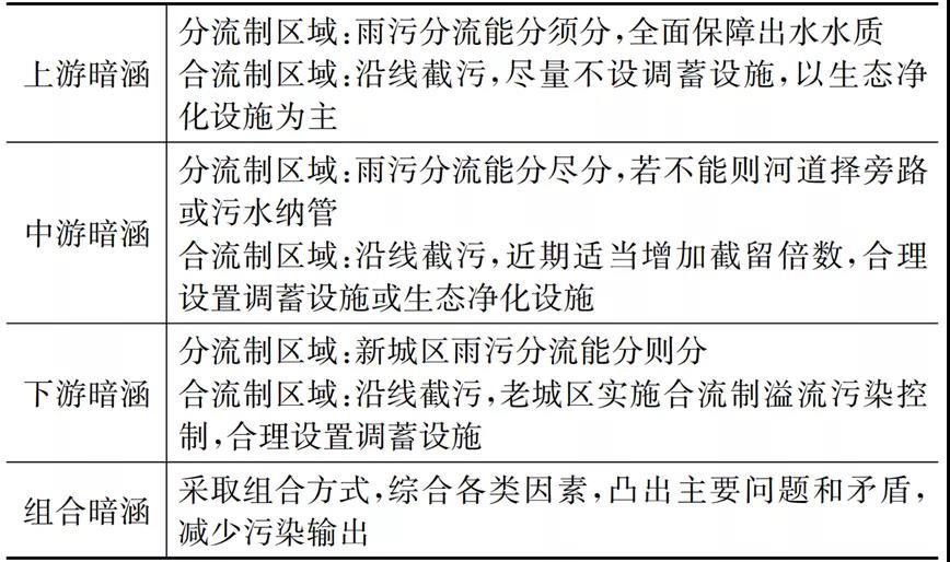 暗涵在控源截污后应实现其河道水质特征,与排水系统协同实现雨污水“各行其道”,全面准确的排口调查及溯源条件下,根据目标水质和水环境容量,对所有点源实施截污改造并有效控制初雨污染和合流制溢流污染。暗涵在不同排水体制下的改造方式见表2,不同条件下或不适宜,应灵活选择。