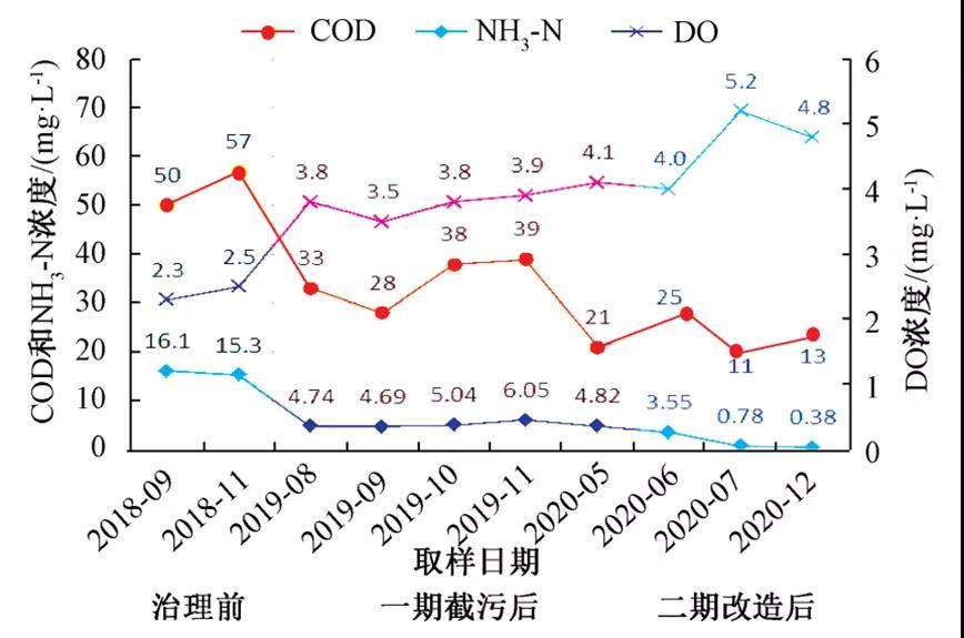 (2)水体特征。水质情况:重度黑臭,主要指标如图4治理前阶段;流量情况:晴天污水+山体存蓄水,雨天合流制排水。