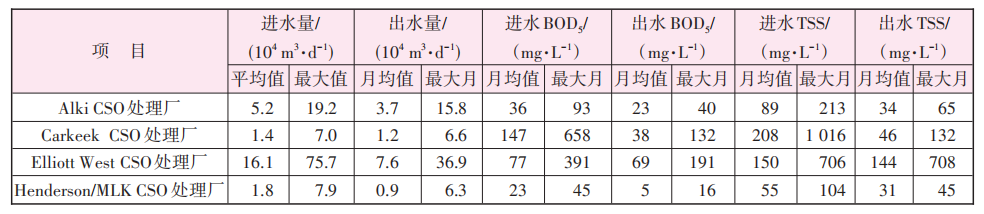 根据金县2009年7月—2013年10月监测数据,4座CSO处理厂进、出水情况如表2所示,为与进水水质进行对比,出水仅列出BOD5和TSS两个参数。
