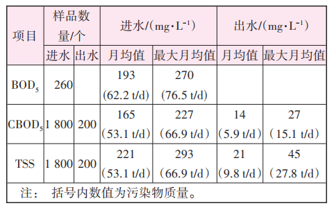 根据金县2009年7月—2013年10月监测数据,西点污水处理厂进、出水水质如表4所示,为与进水水质进行对比,出水仅列出CBOD5、TSS两个参数。
