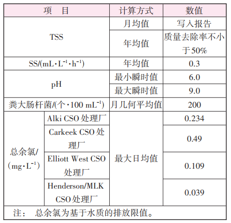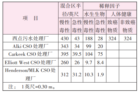 综上,确定受纳水体的混合区稀释因子、水质标准及混合区大小后,便可按照受纳水体水质基准制定相应的污水排放限值,即基于水质的排放限值。NPDES许可(2015年—2020年)中给出了西点污水厂和4个CSO处理厂的混合区范围和稀释因子,具体如表8所示。根据这些数据及所述受纳水体水质基准值,州环保局对各处理厂排放限值进行了校核,表明受纳水体溶解氧、pH、粪大肠杆菌、浊度、有毒物质(氨、氯化物、金属及其他优先控制污染物)及温度等水质基准达标。