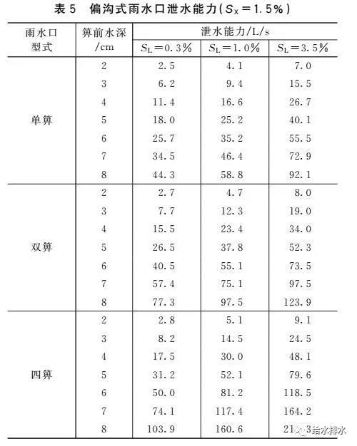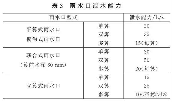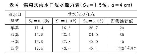 国家标准图集《雨水口》(16S518)提供了一个在一定水力条件下(道路纵坡0.3%~3.5%,横坡1.5%,箅前水深40 mm)通过1∶1的水工模型经过试验确定的不同型式雨水口泄水能力,如表3所示。