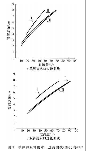 当箅前水深大于40 mm时,图集还提供了雨水口过流曲线图供设计人员查找,见图3。图中Ⅰ、Ⅱ、Ⅲ型分别为道路纵坡0.3%、1.0%和3.5%。